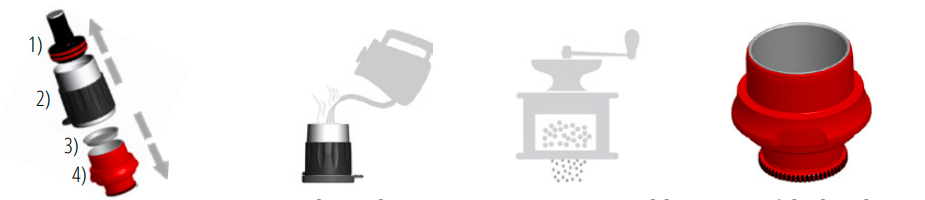 - Separe o cabeçote de infusão - Separe o cabeçote de infusão em quatro partes: 1) Pistão, 2) Cilindro de infusão, 3) Tela, 4) Porta-filtro. Dica: Use o copo dosador para remover o pistão.