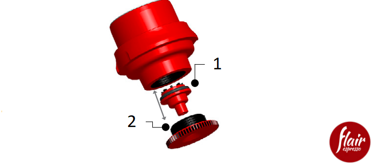 Seu Flex vem com dois "discos de treinamento" (vermelhos); um deles é instalado no êmbolo. Use este disco vermelho quando tiver determinado a força de alavanca apropriada. A vedação de alumínio do disco de treinamento (red) se romperá se for aplicada força excessiva na alavanca, indicando que o café moído está muito fino. Se a vedação de alumínio se romper, a água fluirá para o cabeçote de preparo. Repita o teste com uma moagem mais grossa (tente a consistência de sal marinho fino se estiver usando um porta-filtro Flow-Control) e repita o teste com o segundo disco vermelho.