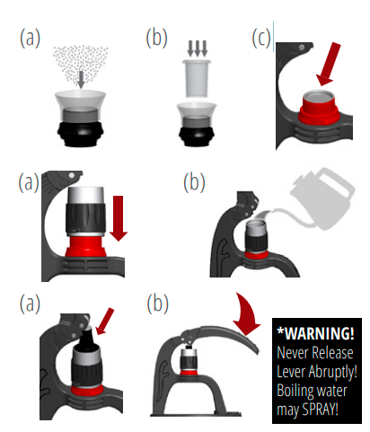 - Pré-aqueça o cilindro de infusão - Ferva a água. Adicione Preheat cap ao fundo do cilindro de infusão. Complete com água fervente. Deixe agir por pelo menos 30 segundos. Repita conforme necessário.