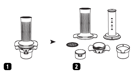 - Rosqueie o cesto do filtro completamente na câmara para evitar vazamentos. Monte o copo com o cesto do filtro.