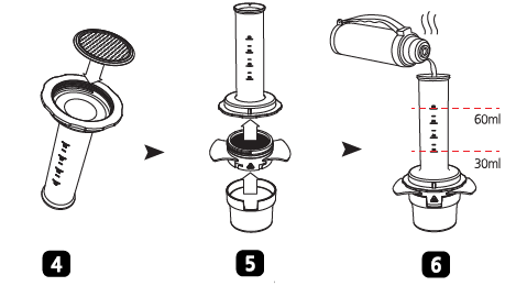 ![]() | CÂMARA (Material: Polietersulfona PES) A câmara do cilindro graduado é feita de material ecológico material e usado para reter água quente. Uma escala é gravada para medir o volume exato de água (30ml-60ml) |