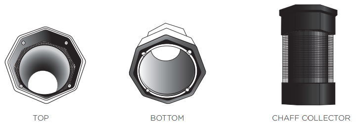 Certifique-se de que o coletor de cascas esteja na posição correta, a tampa esteja no lugar e a chaminé de alumínio esteja totalmente encaixada dentro dele (veja as ilustrações abaixo). Operar este aparelho com o coletor de cascas de cabeça para baixo fará com que as cascas entrem nos grãos torrados e se espalhem pela bancada.