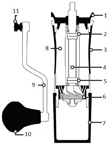 O moedor é composto por três partes principais: (A) cabo de alumínio removível, (B)