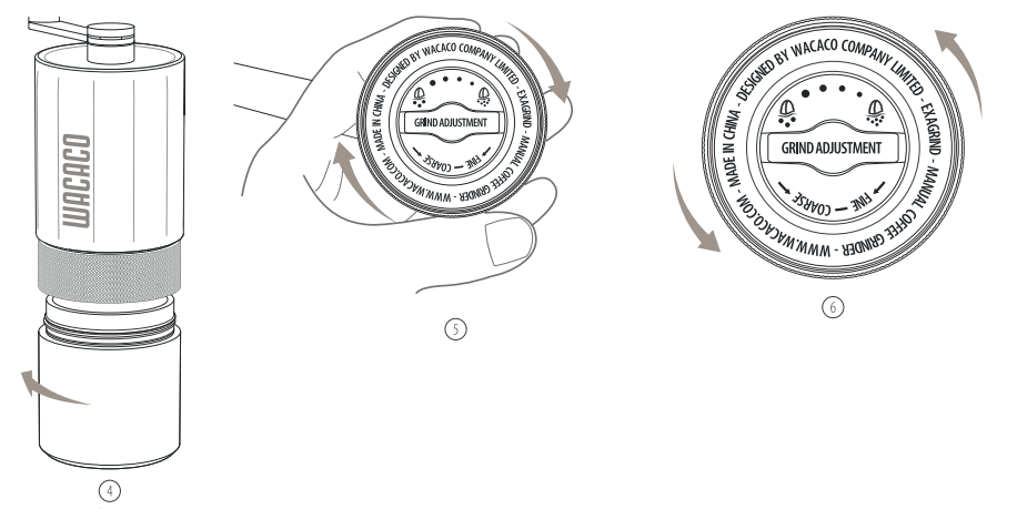 - Gire o botão de ajuste no sentido horário para uma moagem mais fina e no sentido anti-horário para uma moagem mais grossa.