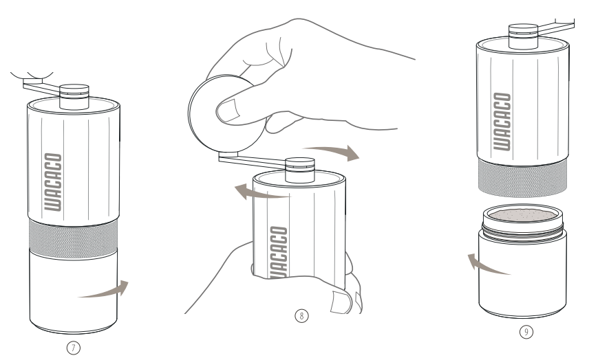 8. Segure o corpo principal com uma mão e gire a alça no sentido horário com a outra mão até que todos os grãos estejam moídos.