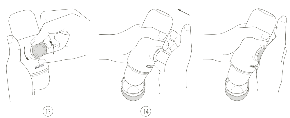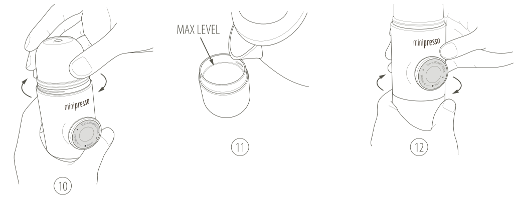 12. Rosqueie firmemente o corpo principal no reservatório de água até o batente. Evite queimaduras. Manuseie com cuidado.